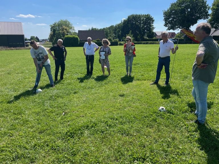 Rond de klok van 12.00u vertrokken we onder een strak blauwe hemel met de bus naar Groesbeek. Bij aankomst op “de Horst” werden we verwelkomd met koffie en een Groesbeekse koeienvlaai. (een heerlijk gebakje met blauwe bessen). Na de inspirerende woorden van de “Boerin” des huizes, waarin de stikstofproblematiek niet werd geschuwd, kregen we uitleg over boerengolf en werden we in teams onder een stralende zon de groene weides in gestuurd. Hier bleek dat de meeste ondernemers toch competitief zijn ingesteld en er werd dan ook een stevige strijd geleverd tussen de teams. Na de prijsuitreiking vertrokken we met de bus voor een korte rit naar het Nederlands Wijnbouwcentrum, waar we werden verwelkomd door gastvrouw Sheila. Tijdens en na de rondleiding door de wijngaard en de wijnkelder werden er diverse Groesbeekse wijnen geproefd. Door het fantastische weer hebben we de hele avond buiten kunnen zitten bij de wijngaarden en genoten van een heerlijk Italiaans buffet. Menigeen memoreerde dan ook dat het even leek of we in Toscane waren. Toen de zon rond 22.00u weg begon te zakken achter de Groesbeekse heuvels, vertrok de bus weer richting Asten. Een bijzonder dankjewel aan buschauffeur Jan van Twintours, die ons de hele dag veilig heeft vervoerd en iedereen weer veilig in Asten heeft afgezet.